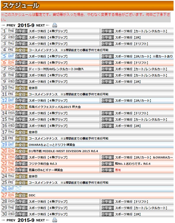 んで、おわらのスケジュール表をみると結構レンタルカートの走行日があるな、と。