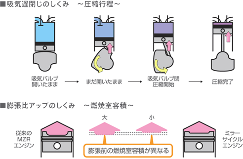 そこで擬似的にアトキンソンサイクルの理論を実現したのがミラーサイクルエンジンというもの。