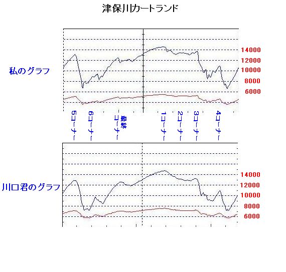 4コーナーの最低回転数を見ても私は6700回転ほどなのに対し、川口君は7300回転ほどです。