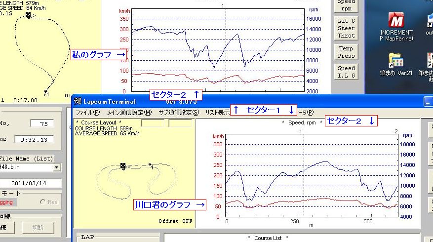 川口君の方が少し手前から減速しているようです。結果として3コーナー旋回中のスピードは川口君の方が速く、4コーナーまでの短いストレートでの回転数は彼の方が高くなるのです。