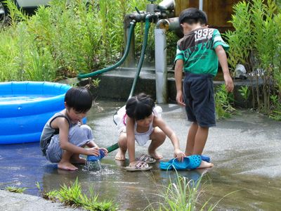9月というのに真夏の日差し。子供はプールで水遊び。