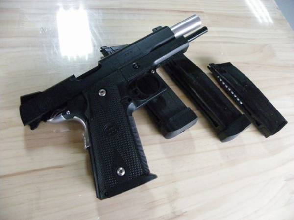 これはエアーコッキングガンです。1発ずつバネを引いて撃つ手動ガンです。