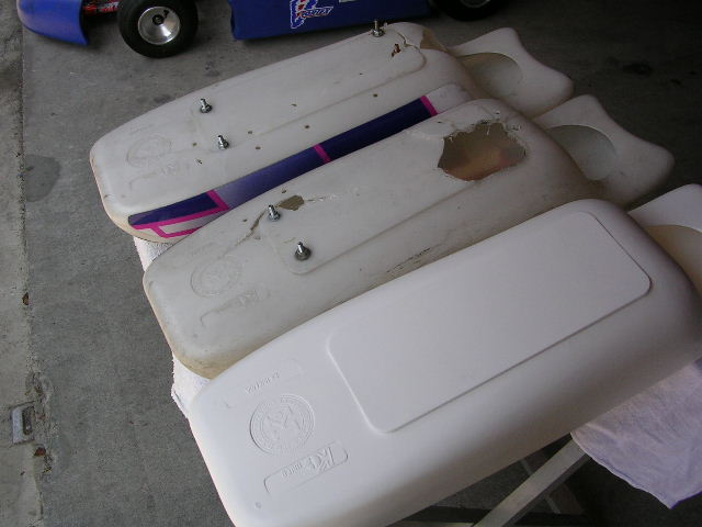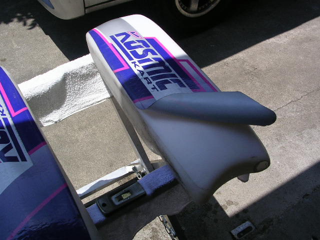 私のマシンのサイドカウルは割れてヒドイ有様だったので、プラスチックボンドで補修して臨みました。しかし、今回の祭りで修復不可能な程に大破。交換です。