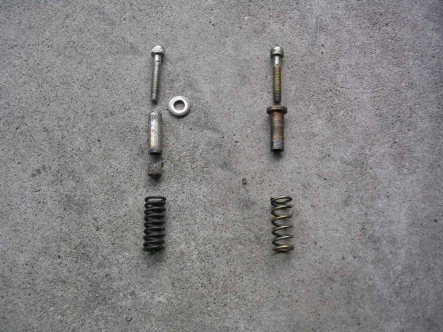 右が純正ボルトとバネ、左がホームセンターで用意したボルトと解体カートから外したバネです。