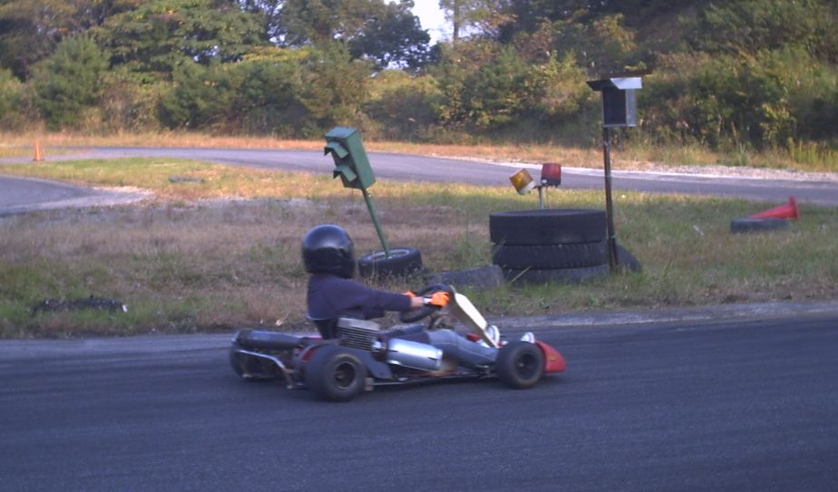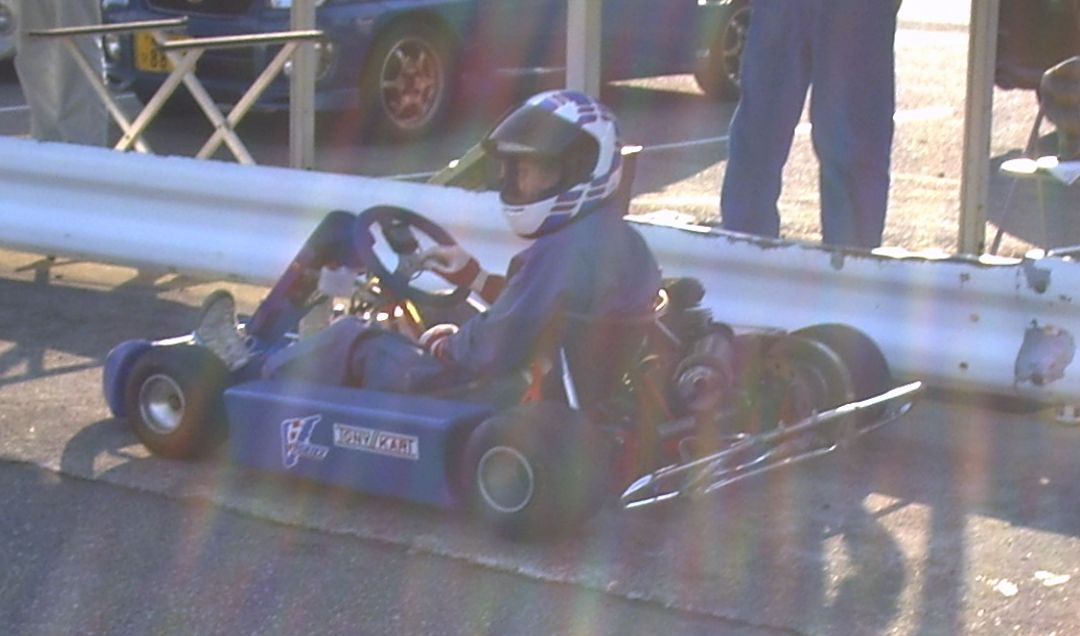 この写真の前にヒロはダイちゃんのカートに乗ってコースアウト。その際にダイちゃんのマシンのスプロケを曲げております。人のマシンを壊してかなりヘコんでいたのですが、走ればこの通りです。